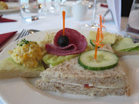 Im Restaurant waren wir so ziemlich bei den ersten Gästen, und Romana hat Wort gehalten und uns den kleinen Vierertisch in einer gemütlichen Ecke reserviert. Als Kellner hat wir wieder Nikola, der sich auch sofort wieder an uns erinnert hat. Ich habe wie immer schnell das Buffet fotografiert, aber da ich nichts gefrühstückt hatte, habe ich mich dann doch für Essen entschieden und mit einer Gemüse-Cremesuppe mit Croutons begonnen. Es hab wieder vier verschiedene Sandwiches, sehr ansprechend hergerichtet, Salate und zwei verschiedene Mehlspeisen. Die Romana ist dann auch zu uns an den Tisch gekommen und hat uns gefragt, ob uns der Tisch gefällt und ob alles in Ordnung ist, sehr zuvorkommend - aber die weiß schon, warum! Beim Mittagessen mussten wir auch schon die Hauptspeise für den Abend bestellen, Inge und Franzi haben sich wieder für das Gansl entschieden, ich habe mir dieses Mail die Schweinsmedaillons ausgesucht.